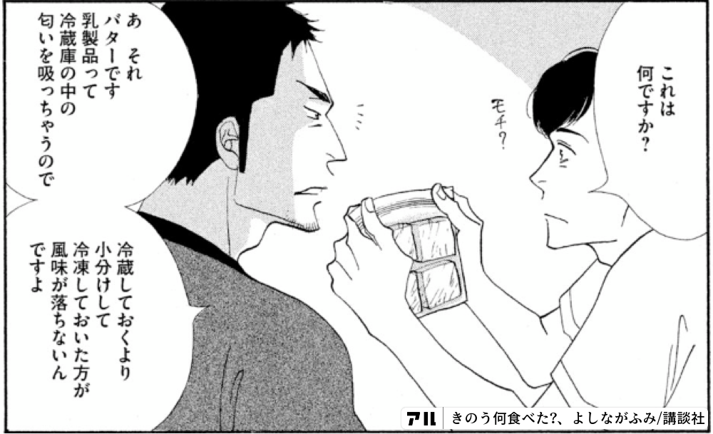 乳製品って冷蔵庫の中の匂いを吸っちゃうので冷蔵しておくより小分けして冷凍しておいた方が一風味が落ちないんですよ きのう何食べた アル